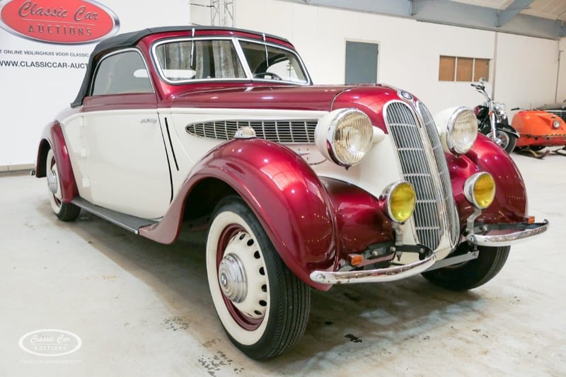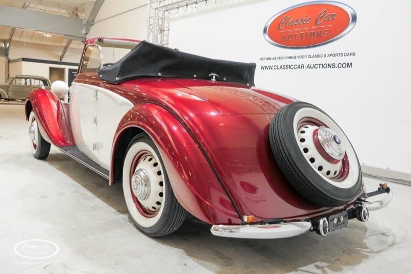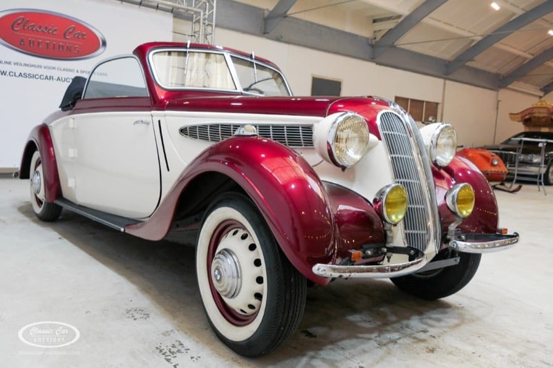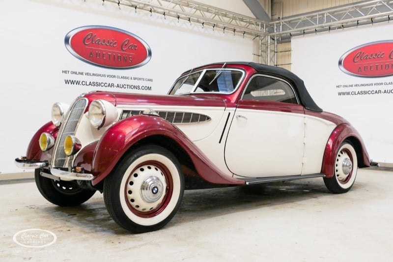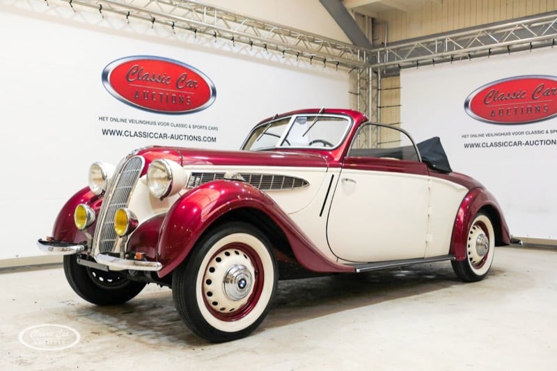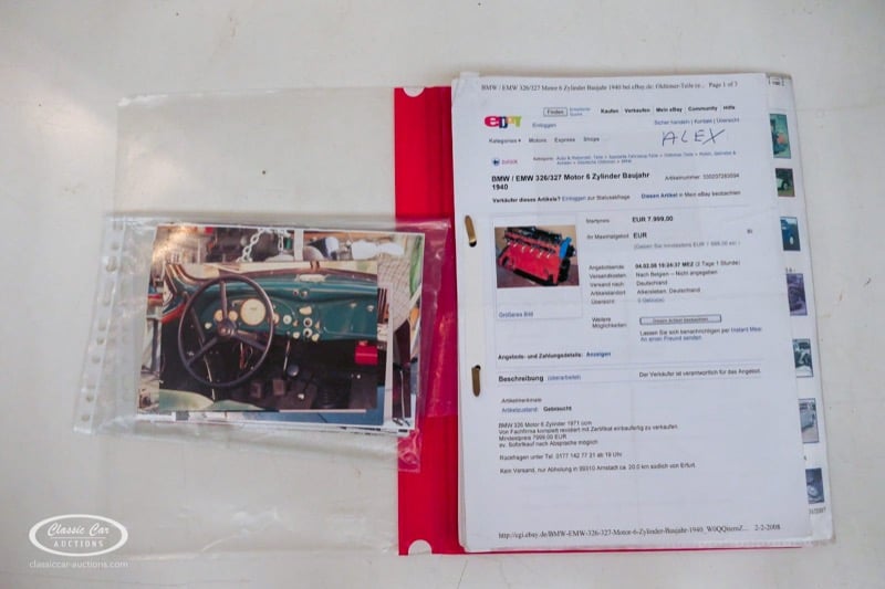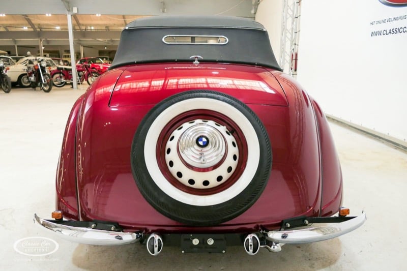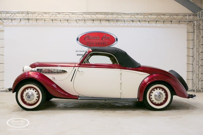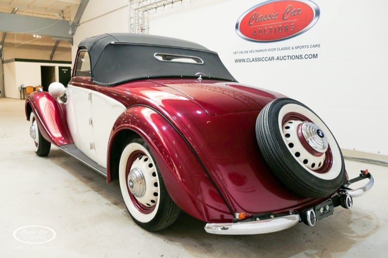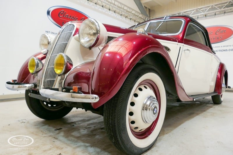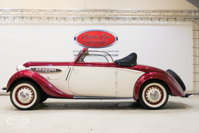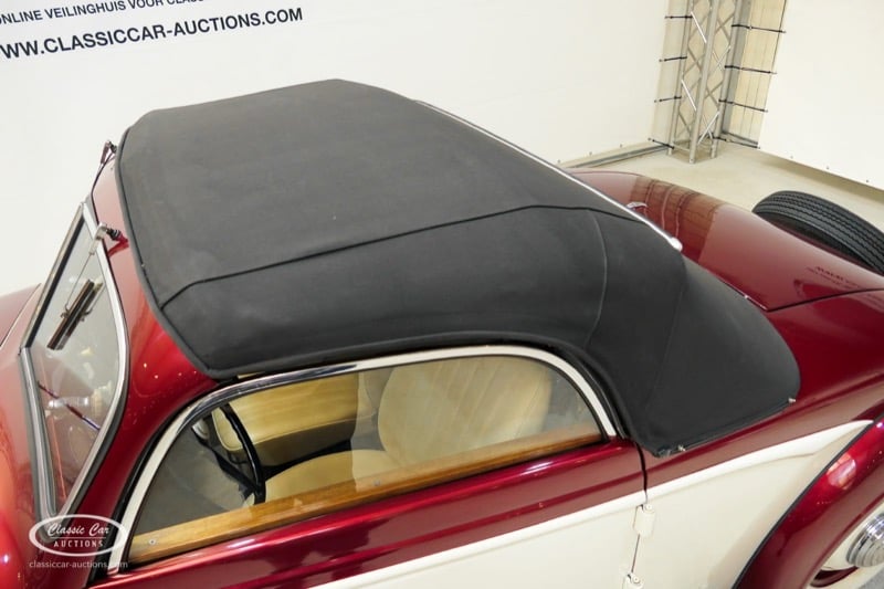 Deze BMW 326 roadster heeft een zeer rijke historie. In 1936 is hij gebouwd door de bekende carrosserie bouwer Drauz. Drauz bouwde auto’s naar wens van de klant om naar roadsters of convertibles. Tijdens de oorlog heeft hij in Duitsland gereden, maar is in de jaren daarna geëxporteerd naar Chili. Daar heeft de dochter van de huidige eigenaar de wagen ontdekt in de jaren 80 en vanuit Chili geïmporteerd naar Belgie. De huidige eigenaar heeft de wagen gerestaureerd, wat geheel gedocumenteerd is doormiddel van een boekwerk aan facturen, onderzoek en foto’s. Ook zit er een technisch handboek bij. Na restauratie is de auto op Belgisch kenteken gezet en is hij inmiddels ruim 40 jaar in het bezit van dezelfde eigenaar. Deze heeft de auto in een privécollectie gehouden en bij gelegenheid een toer mee gemaakt. De auto bevindt zich dan ook in een rijdende staat. Zowel het interieur als het exterieur zien er over het algemeen netjes uit. Om een goed beeld van de auto te krijgen adviseren wij u naar een van onze kijkdagen te komen.