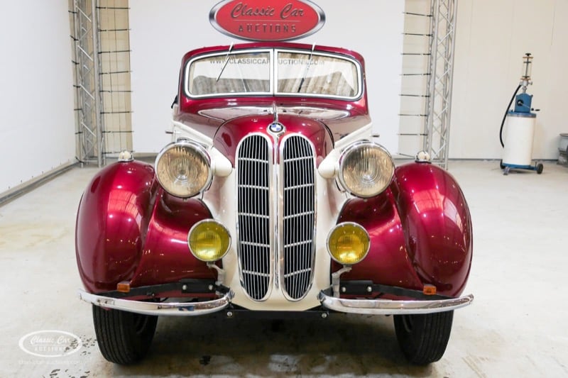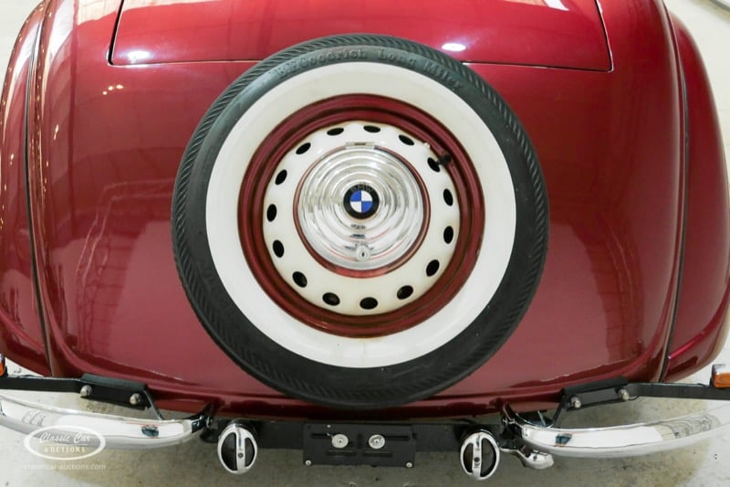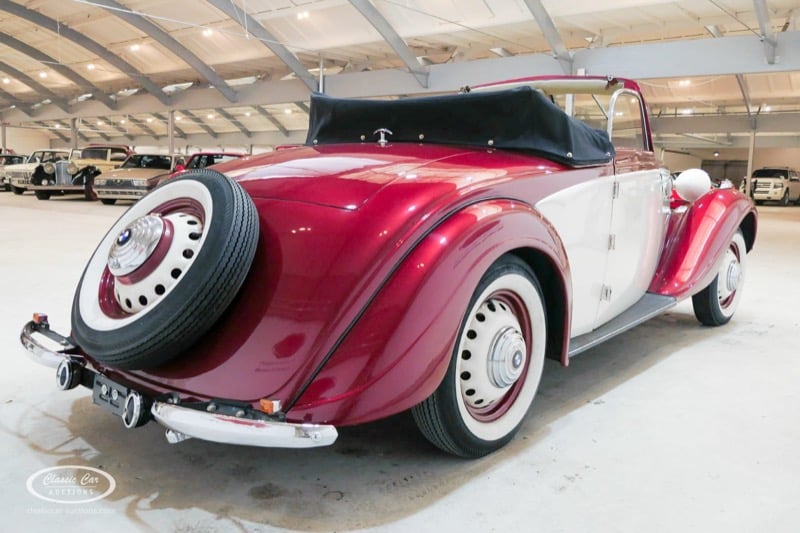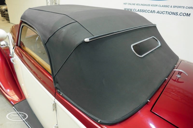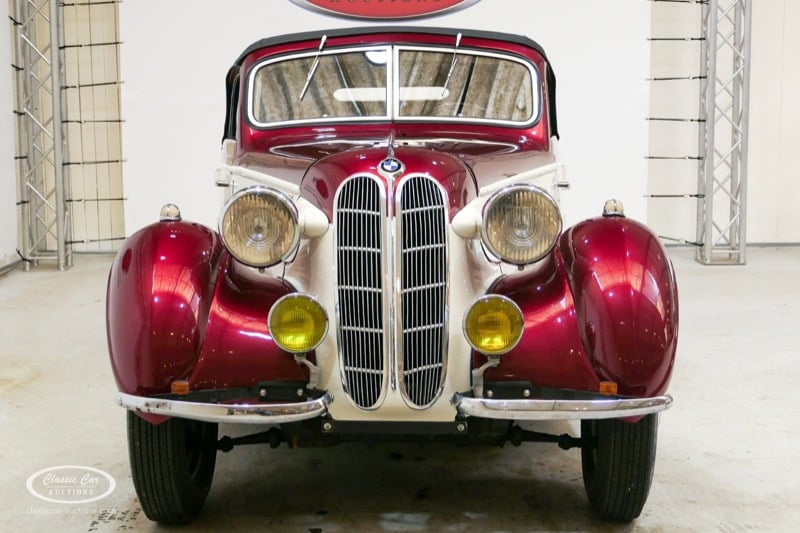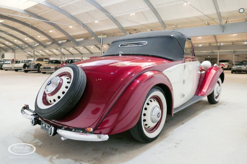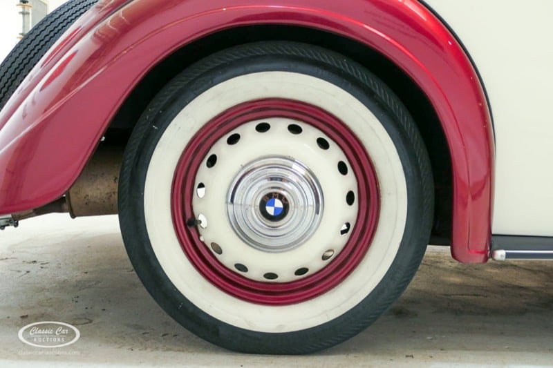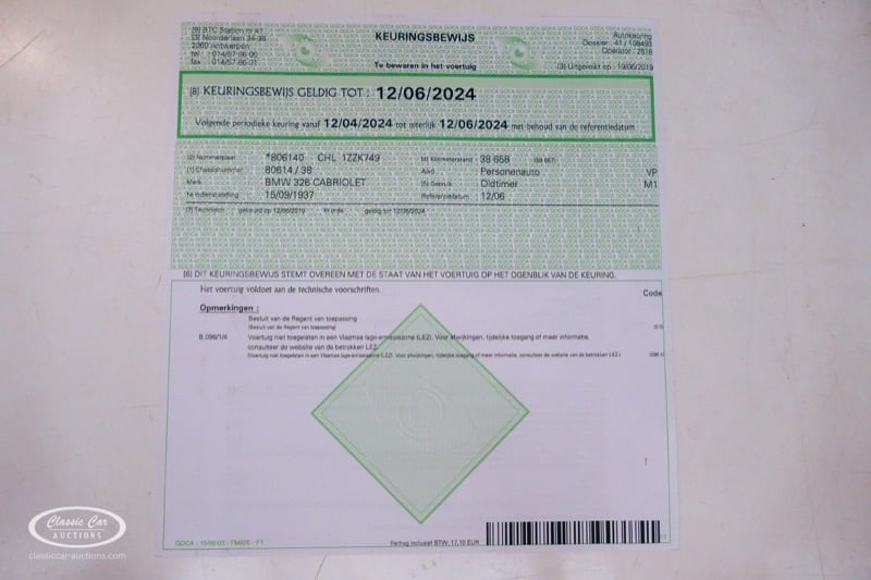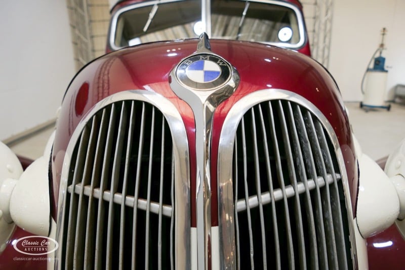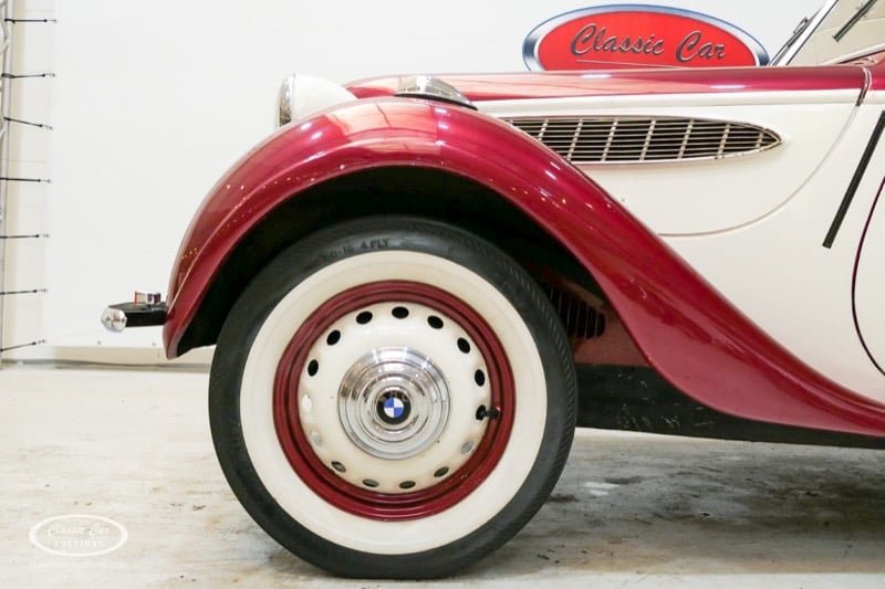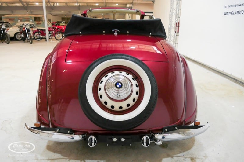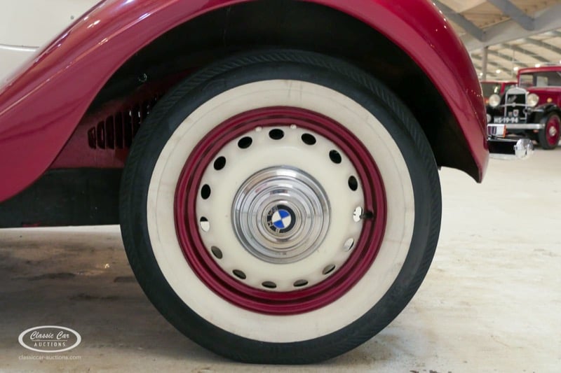 Deze BMW 326 roadster heeft een zeer rijke historie. In 1936 is hij gebouwd door de bekende carrosserie bouwer Drauz. Drauz bouwde auto’s naar wens van de klant om naar roadsters of convertibles. Tijdens de oorlog heeft hij in Duitsland gereden, maar is in de jaren daarna geëxporteerd naar Chili. Daar heeft de dochter van de huidige eigenaar de wagen ontdekt in de jaren 80 en vanuit Chili geïmporteerd naar Belgie. De huidige eigenaar heeft de wagen gerestaureerd, wat geheel gedocumenteerd is doormiddel van een boekwerk aan facturen, onderzoek en foto’s. Ook zit er een technisch handboek bij. Na restauratie is de auto op Belgisch kenteken gezet en is hij inmiddels ruim 40 jaar in het bezit van dezelfde eigenaar. Deze heeft de auto in een privécollectie gehouden en bij gelegenheid een toer mee gemaakt. De auto bevindt zich dan ook in een rijdende staat. Zowel het interieur als het exterieur zien er over het algemeen netjes uit. Om een goed beeld van de auto te krijgen adviseren wij u naar een van onze kijkdagen te komen.