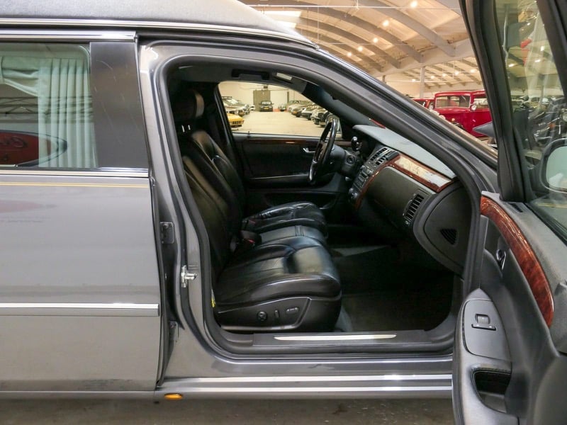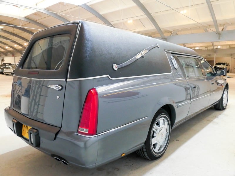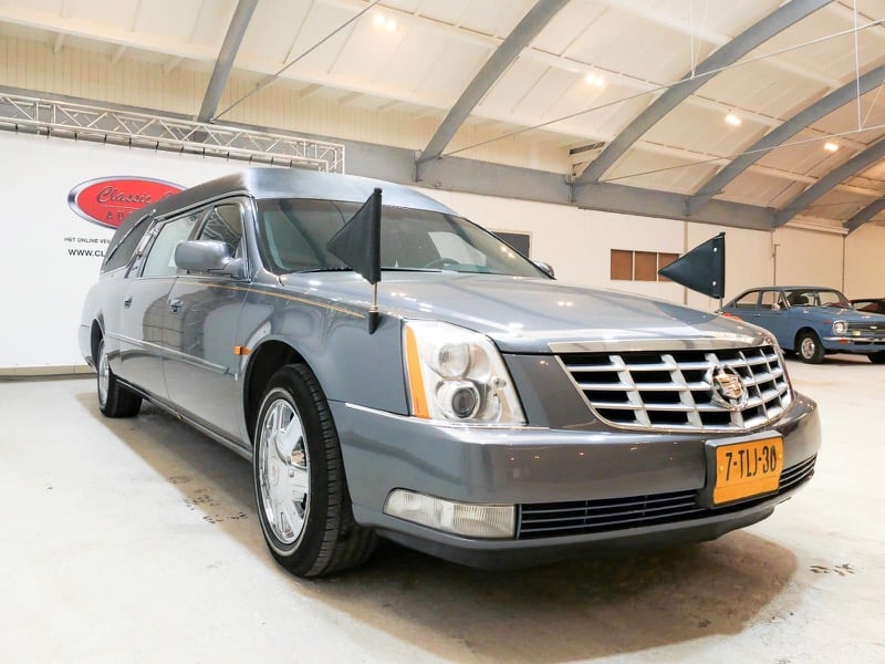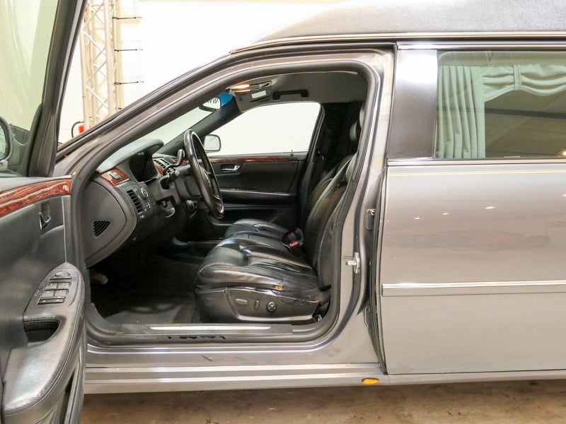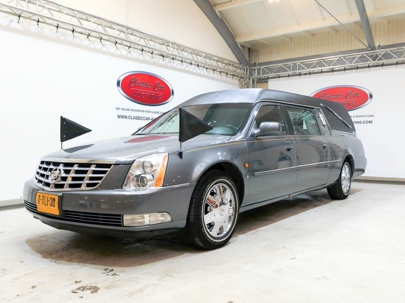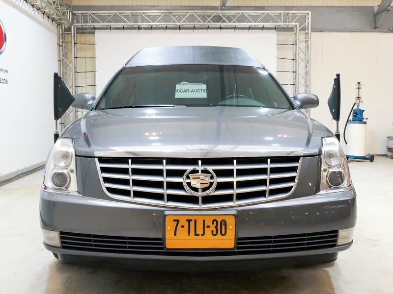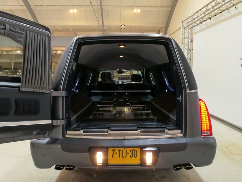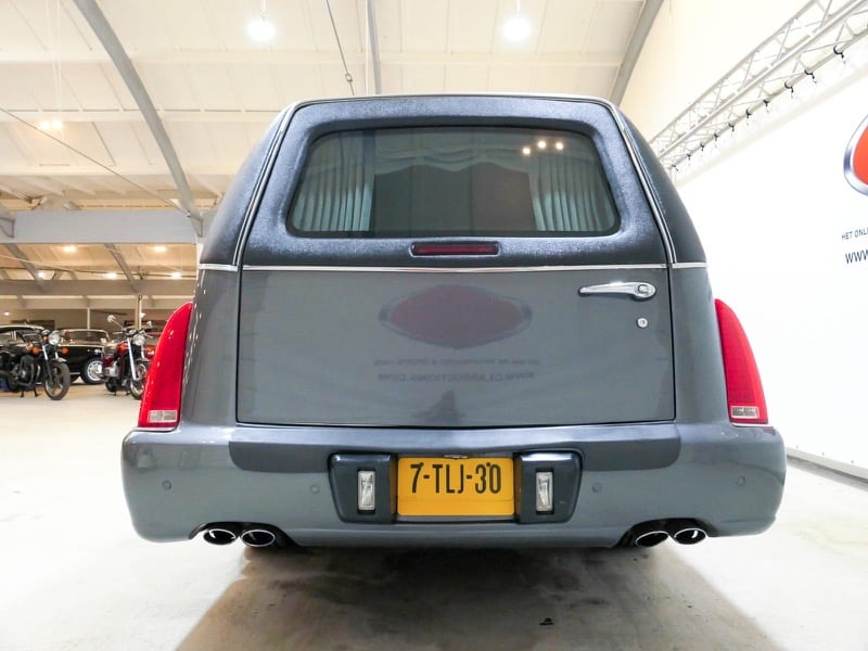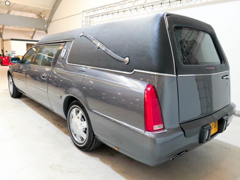 Ce corbillard Cadillac DTS 2006 a été construit par Sayers & Scoville. Un corbillard majestueux de couleur anthracite avec une construction en vinyle noir de la marque américaine Cadillac. Cette couleur grise s'appelle Academic Grey. Très élégant, majestueux et en raison de l'utilisation de la couleur moins traditionnelle qu'un véhicule noir. Ce corbillard est conçu comme un landaulet, ce qui signifie que le dos est fermé et que le cercueil est caché à la vue. L'intérieur est en cuir noir et un sol de couleur marbre. Pour avoir une bonne impression de la voiture, nous vous conseillons de venir à l'une des journées de visite.