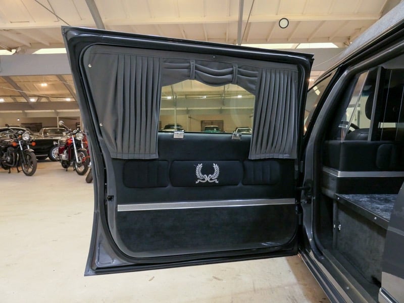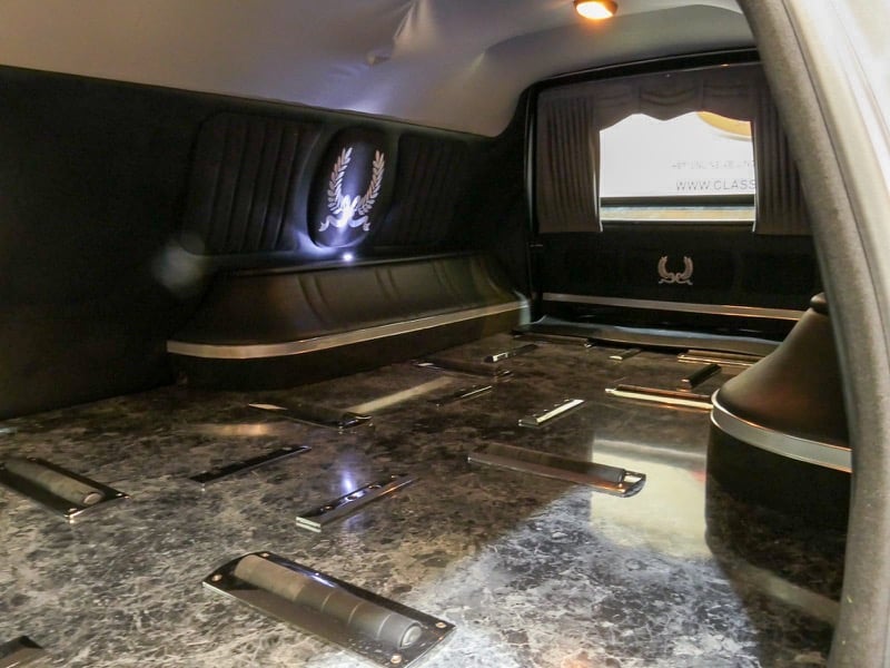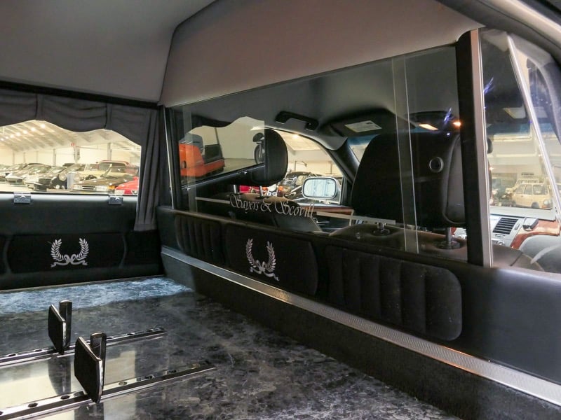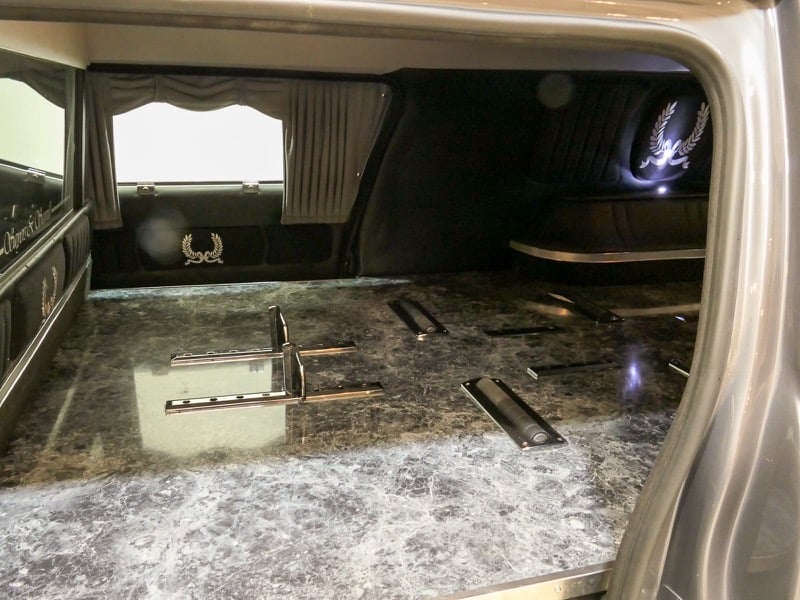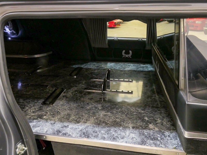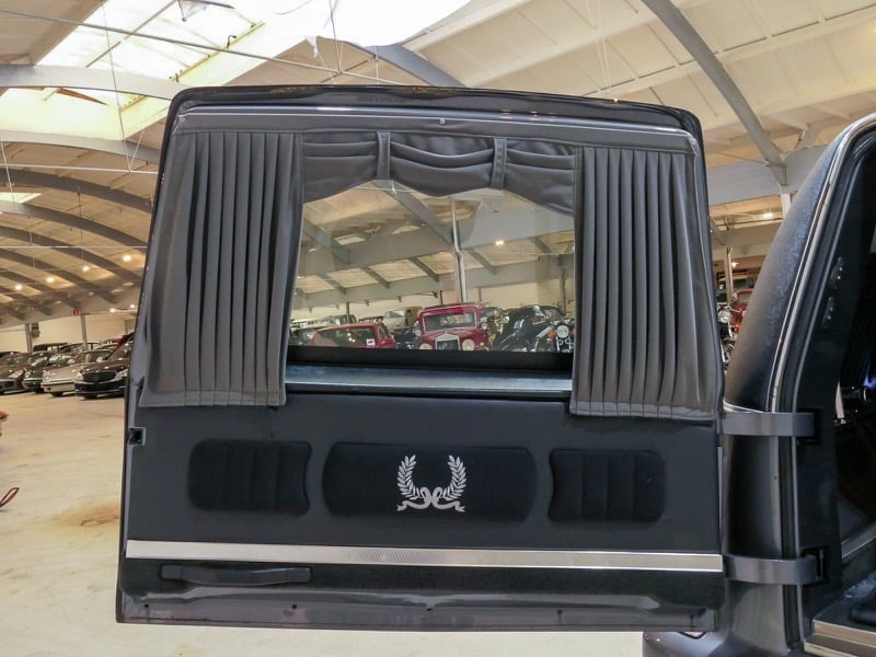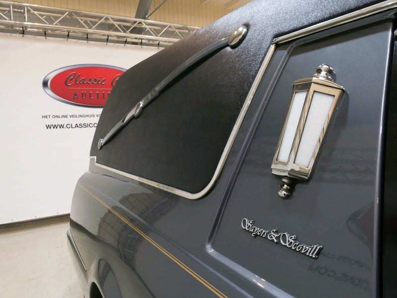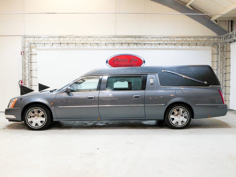 Ce corbillard Cadillac DTS 2006 a été construit par Sayers & Scoville. Un corbillard majestueux de couleur anthracite avec une construction en vinyle noir de la marque américaine Cadillac. Cette couleur grise s'appelle Academic Grey. Très élégant, majestueux et en raison de l'utilisation de la couleur moins traditionnelle qu'un véhicule noir. Ce corbillard est conçu comme un landaulet, ce qui signifie que le dos est fermé et que le cercueil est caché à la vue. L'intérieur est en cuir noir et un sol de couleur marbre. Pour avoir une bonne impression de la voiture, nous vous conseillons de venir à l'une des journées de visite.