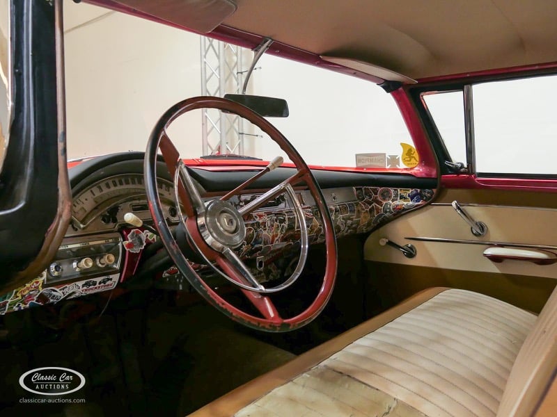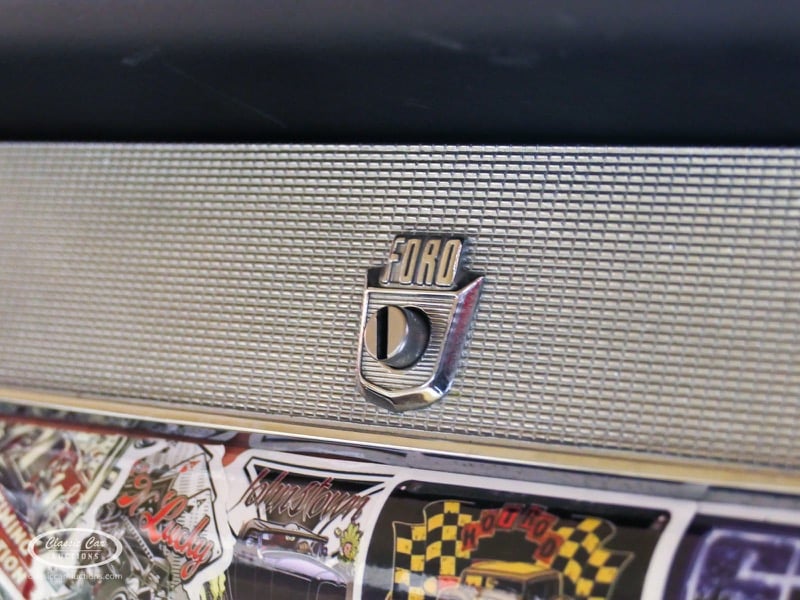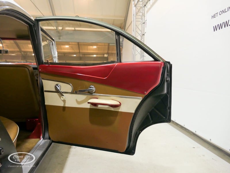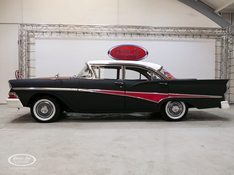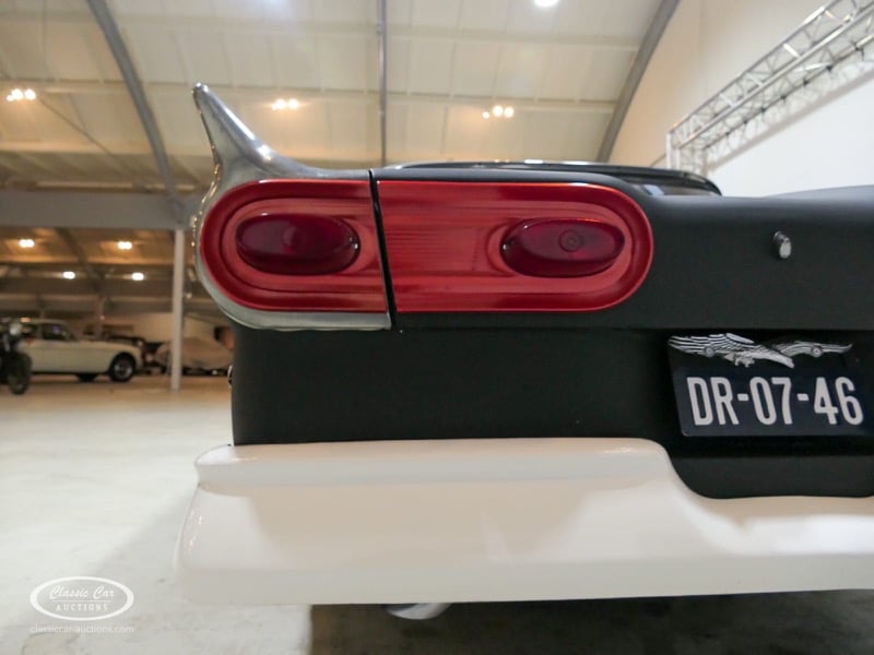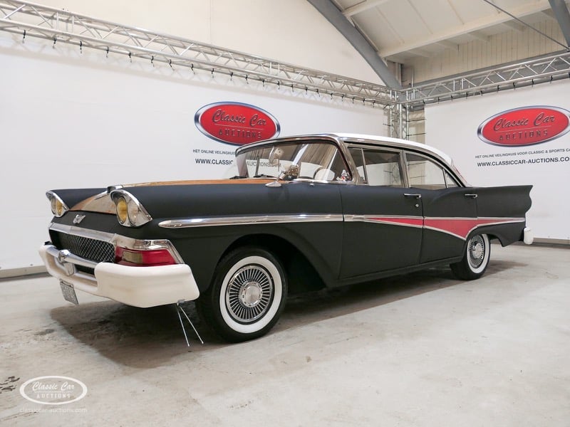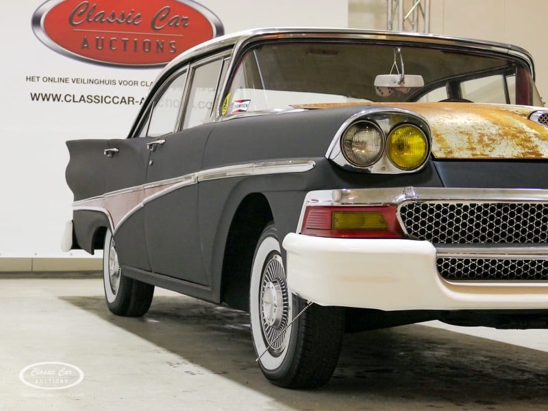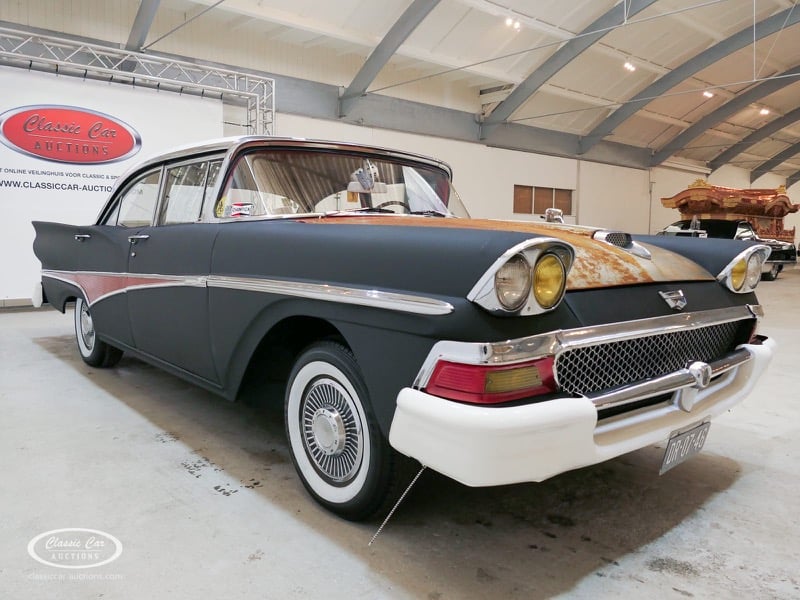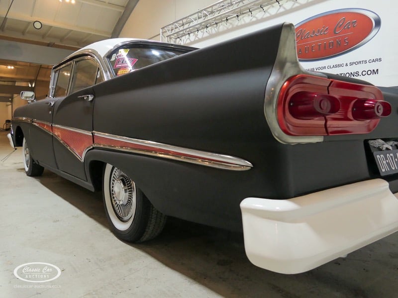 Cette Ford Fairlane est une apparence frappante. Il s'agit d'un modèle de 1958, immatriculé en 1959. Initialement livrée en rose tendre, la Ford a été modifiée dans le style Hot-Rod. Le Fairlane a un look robuste dû, entre autres, à la peinture noire mate, au capot aspect rouille et à de nombreux autocollants. Les pare-chocs sont fabriqués sur mesure. Le six cylindres de 3,3 L est équipé d'une installation GPL, d'un allumage électronique et d'une nouvelle batterie. De plus, un nouvel échappement a été installé, les freins ont été révisés et l'allumage, les bougies d'allumage, l'huile et les filtres ont été remplacés. La boîte de vitesses manuelle a trois vitesses. Le Fairlane est aux Pays-Bas depuis 1997 et est exonéré à la fois de la taxe de circulation et du MOT. Pour avoir une bonne image du lot, nous vous conseillons de venir le jour de la visite.
